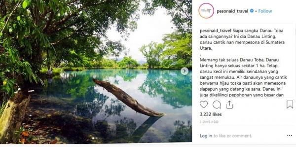 "Siapa sangka Danau Toba ada saingannya? Ini dia Danau Linting, danau cantik nan memesona di Sumatera Utara. Memang tak seluas Danau Toba, Danau Linting hanya seluas sekitar 1 ha. Tetapi danau kecil ini memiliki keindahan yang sangat memukau. Air danaunya yang cantik berwarna hijau toska pasti akan memesona siapapun yang datang ke sana. Danau ini juga dikelilingi pepohonan yang besar dan rindang, sehingga menjadi keunikan, dan daya tarik tersendiri bagi Danau Linting. Tepat di bibir danau, terdapat sebuah ayunan yang akan memberi sensasi tersendiri dan pastinya mengesankan. Danau Linting terletak di Desa Sibunga-bunga Hilir, Kecamatan Senembah Tanjung Muda Hulu, Kabupaten Deli Serdang. Hanya berjarak kira-kira dua jam perjalanan dari Kota Medan. Bisa jadi list destinasi kalian nih kalau ke Medan atau Sumatera Utara," tulis Instagram @Pesonaid_Travel dikutip Selasa (4/11/2018).