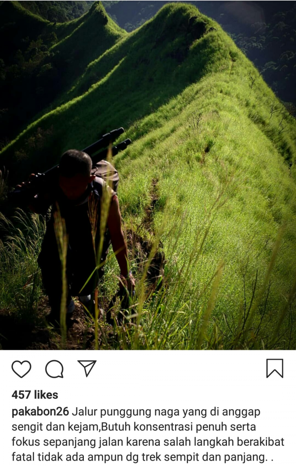"Jalur punggung naga yang dianggap sengit dan kejam. Butuh konsentrasi penuh serta fokus sepanjang jalan, karena salah langkah berakibat fatal tidak ada ampun dengan trek sempit dan panjang," tulis Instagram @pakabon26, dikutip Kamis (11/7/2019).