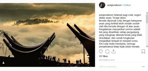 "Selamat pagi Lolai, negeri di atas awan, Toraja Utara. Berada di puncak Lolai dengan hamparan awan yang terlihat lebih rendah seolah-olah kita berada di negeri di atas awan. Pengalaman menyambut sunrise adalah hal yang dinantikan setiap pengunjung yang menginap ditenda-tenda yang telah disediakan, dan rumah tongkonan menjadikan tempat ini menjadi iconic. Kini Lolai mulai mendunia, semoga pengelolanya tetap bijak untuk menata dan menjaga alam di sekitarnya," tulis Instagram @aresjonekson, dikutip Jumat (8/3/2019).
