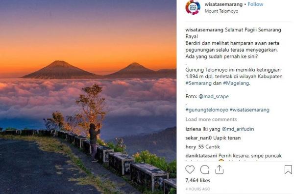 "Berdiri dan melihat hamparan awan serta pegunungan selalu terasa menyegarkan. Ada yang sudah pernah ke sini? Gunung Telomoyo ini memiliki ketinggian 1.894 m dpl, terletak di wilayah Kabupaten #Semarang dan #Magelang," tulis Instagram @WisataSemarang dikutip Rabu (5/9/2018).
