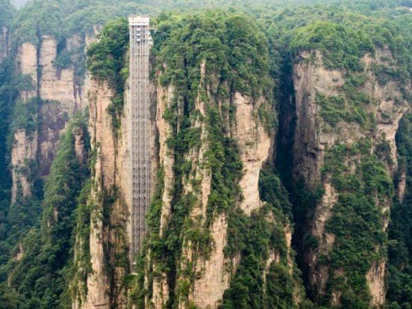 Dibangun di taman hutan nasional Hunan Xiang Xhangjiajie, bangunan ini dianggap sebagai lift outdoor tertinggi dan terberat di dunia. Lift ini dapat membawa 50 orang sampai dengan ketinggian 1.070 kaki atau 330 meter. Elevatornya yang terbuat dari kaca, membuat wisatawan dengan mudah melihat pemandangan indah di depannya.