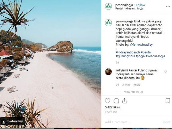 "Enaknya piknik pagi hari lebih awal adalah dapat foto sepi gak ada yang ganggu (bocor). Lebih kelihatan alami dan natural. Pantai Indrayanti, Tepus, Gunungkidul. Photo by: @ferrowbradley," tulis Instagram @Pesonajogja, (13/6/2019).
