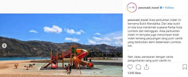 "Area perbukitan indah ini bernama Bukit Mandalika. Dari atas bukit ini kita bisa menikmati suasana Pantai Kuta Lombok dari ketinggian. Area perbukitan indah ini ternyata juga menyimpan kisah indah tentang perjuangan sang putri cantik yang berkorban demi kedamaian Lombok, loh," tulis Instagram @Pesonaid_Travel, Kamis (15/11/2018).