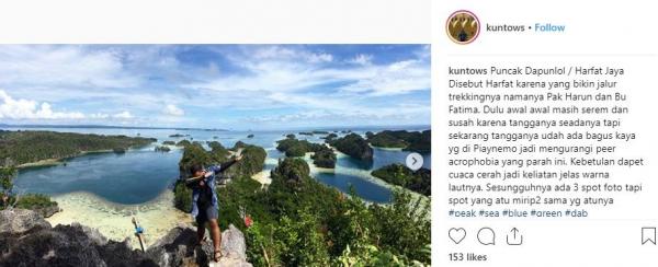 "Puncak Dapunlol/Harfat Jaya Disebut Harfat karena yang bikin jalur trekkingnya namanya Pak Harun dan Bu Fatima. Dulu awal awal masih serem dan susah karena tangganya seadanya, tapi sekarang tangganya udah ada bagus kaya yg di Piaynemo jadi mengurangi peer acrophobia yang parah ini. Kebetulan dapet cuaca cerah jadi keliatan jelas warna lautnya. Sesungguhnya ada 3 spot foto tapi spot yang satu mirip2 sama yg satunya," tulis Instagram @kuntows, Jumat (12/4/2019).