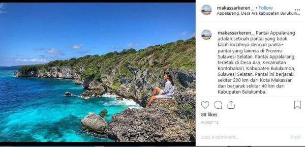 "Pantai Appalarang adalah sebuah pantai yang tidak kalah indahnya dengan pantai-pantai yang lainnya di Provinsi Sulawesi Selatan. Pantai Appalarang ini tidak seperti pantai pada umumnya yang langsung bersentuhan dengan pasir putihnya. Pantai Appalarang ini berada di balik tebing bebatuan yang curam. Kondisi inilah yang memicu adrenalin setiap pengunjung yang datang. Pantai Appalarang ini disebut-sebut memiliki kemiripan dengan Raja Ampat Papua yang sudah sangat populer itu. Jadi, tidak heran jika banyak yang menyebut bahwa Pantai Apparalang merupakan Raja Ampat-nya Bulukumba. Pantai Appalarang sukses menjadi salah satu obyek wisata andalan Sulawesi Selatan," tulis Instagram @makassarkeren dikutip Jumat (4/10/2019).
