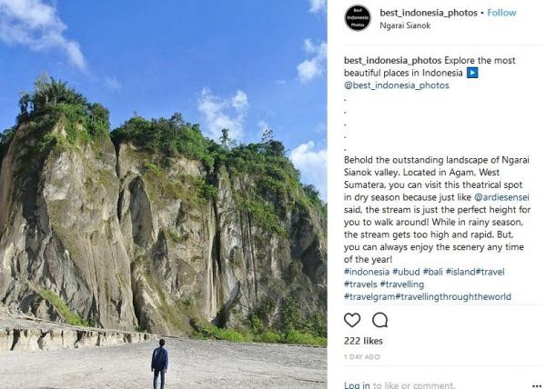 "Lihatlah pemandangan luar biasa lembah Ngarai Sianok. Terletak di Agam, Sumatera Barat, Anda dapat mengunjungi tempat teatrikal ini di musim kemarau karena sama seperti @ardiesensei berkata, sungainya memiliki ketinggian yang sempurna bagi Anda untuk berjalan-jalan! Sementara di musim hujan, alirannya menjadi terlalu tinggi dan cepat. Namun, Anda dapat menikmati pemandangan setiap saat sepanjang tahun," tulis Instagram @best_indonesia_photos, dikutip Jumat (29/6/2018).