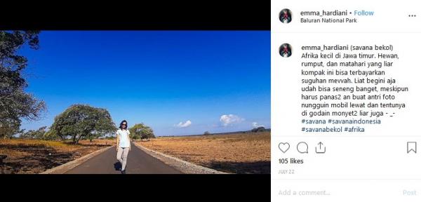 "(savana bekol) Afrika kecil di Jawa timur. Hewan, rumput, dan matahari yang liar kompak ini bisa terbayarkan suguhan mewah. Liat begini saja udah bisa seneng banget, meskipun harus panas-panasan buat antre foto nungguin mobil lewat dan tentunya digodain monyet-monyet liar juga," tulis Instagram @emma_hardiani, dikutip Kamis (29/8/2019).