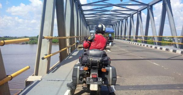 Puas berfoto kami meninggalkan pusat kota melaju di jalur yang lurus dan panas, dengan ukuran jalan yang tak selebar jalur di Kalimantan Barat. Namun karena mulus dan cenderung sepi, bisa memacu motor lumayan kencang. Sampai di sekitar Kuala Kapuas, jalanan lurus terus menerus. Baru memasuki ibu kota Kabupaten Kapuas ini, kami melihat jalan berdampingan dengan Sungai yang airnya terlihat tenang. Ya, Sungai Kapuas membentang di depan mata.