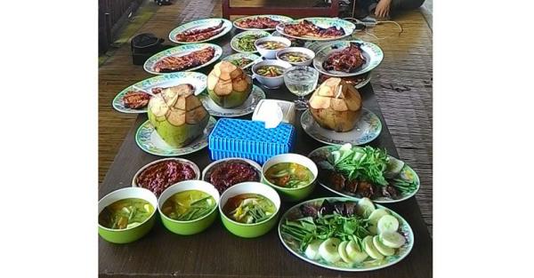 Hari itu kami diajak makan oleh adik Bu Ellis yang kebetulan bertugas di Polda Kalimantan Selatan. Jam 12.00 hidangan sudah tersaji saat kami tiba di Restoran Kampung Lauk. Restoran terkenal di kota ini dan ramai pengunjung. Pilihan tempat duduk kami strategis, tepat di pinggir Sungai Kahayan. Dari sini kami dapat melihat jembatan Kahayan yang megah dari kejauhan.
