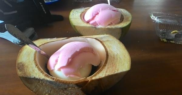 Pukul 08.00 WIB dari Hotel Golden Tulip Pontianak tim sudah siap berangkat. Usai sarapan, kami masih tergoda untuk mencicipi makanan khas Pontianak yang terkenal, yaitu es krim kelapa Angi. Ini adalah es krim yang disajikan dalam batok kelapa sehingga bisa dinikmati sambil mengerok kelapa.
