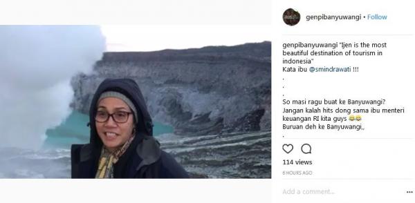 Kunjungan Sri Mulyani ke Kawah Ijen untuk meninjau persiapan Banyuwangi, dia datang bersama dengan rombngan dari Kementerian Keuangan, Gubernur Bank Indonesia Agus Martowardojo, Bank Indonesia, Kementerian Koordinator Bidang Kemaritiman, Kementerian Pariwisata, Kementerian Lingkungan Hidup dan Kehutanan, Kementerian Pekerjaan Umum dan Perumahan Rakyat, serta Bupati Banyuwangi Abdullah Azwar Anas.