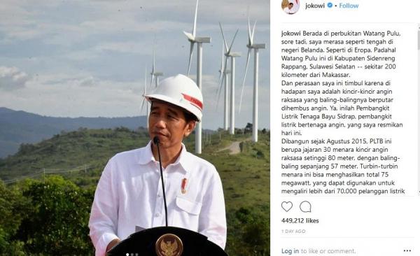 "Berada di perbukitan Watang Pulu, sore tadi, saya merasa seperti tengah di negeri Belanda. Seperti di Eropa. Padahal Watang Pulu ini di Kabupaten Sidenreng Rappang, Sulawesi Selatan. Sekitar 200 kilometer dari Makassar. Dan perasaan saya ini timbul karena di hadapan saya adalah kincir-kincir angin raksasa yang baling-balingnya berputar dihembus angin. Ya, inilah Pembangkit Listrik Tenaga Bayu Sidrap, pembangkit listrik bertenaga angin, yang saya resmikan hari ini," tulis Presiden RI Joko Widodo, dikutip melalui Instagram @Jokowi, Rabu (7/4/2018).