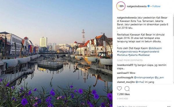 "Jalur pedestrian Kali Besar di Kawasan Kota Tua, Tamansari, Jakarta Barat. Jalur pedestrian ini diresmikan pada 6 Juli 2018 lalu. Revitalisasi Kawasan Kali Besar ini dimulai sejak 2016. Di atas kali terdapat area terapung tetapi saat ini belum dibuka," tulis Instagram @natgeoindonesia, dikutip Selasa (10/7/2018).