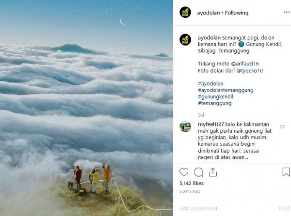 "Semangat pagi, dolan ke mana hari ini? Gunung Kendil, Sibajag, Temanggung. Tukang moto @arifauzi16. Foto dolan dari @tyoeko10," tulis Instagram @ayodolan, dikutip Kamis (26/9/2019).