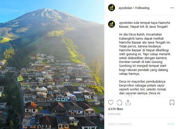 "Ini dia Desa Butuh, Kecamatan Kaliangkrik. Kamu dapat melihat Namche Bazaar ala Jawa Tengah di sini. Tidak persis, karena bedanya Namche Bazaar di Nepal dikelilingi oleh gunung es. Tapi cukup menarik untuk diabadikan dengan kamera. Deretan rumah di kaki Gunung Sumbing ini menjadi tempat start bagi ratusan pendaki yang datang setiap harinya. Ayo dolan ke sini!" tulis Instagram @ayodolan, dikutip Selasa (25/6/2019).