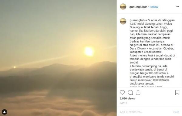 "Sunrise di ketinggian 1.037 mdpl Gunung Luhur. Walau Gunung ini tidak terlalu tinggi, namun jika kita berada di sini pagi hari, kita bisa melihat hamparan awan putih,yang semakin cantik berhias kemilau sunrisenya. Negeri di atas awan ini, berada di Desa Citorek - Kecamatan Cibeber, Kabupaten Lebak Banten. Akses menuju ke sini sudah dapat di tempuh dengan kendaraan roda empat," tulis Instagram @gunungluhur, dikutip Rabu (25/9/2019).