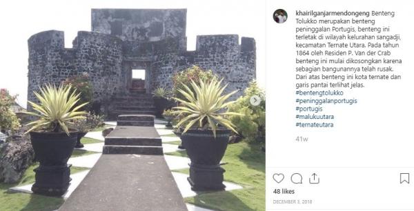 "Benteng Tolukko merupakan benteng peninggalan Portugis, benteng ini terletak di wilayah kelurahan sangadji, kecamatan Ternate Utara. Pada tahun 1864 oleh Residen P. Van der Crab benteng ini mulai dikosongkan karena sebagian bangunannya telah rusak. Dari atas benteng ini kota ternate dan garis pantai terlihat jelas," tulis Instagram @khairilganjarmendongeng, dikutip Jumat (20/9/2019).