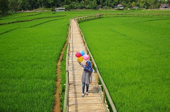 Hamparan sawah di Dusun Sukorame, Mangunan, Dlingo, Bantul terlihat sangat indah. Dari atas jembatan sepanjang 357 meter yang melingkar di tengah sawah, Anda dapat berfoto dengan hamparan padi sebagai latar belakang. Selain sawah di Sukorame, masih ada tempat wisata lainnya. Berikut ini objek wisata di Yogyakarta yang sedang hits dirangkum iNews.id, Minggu (18/3/2018).