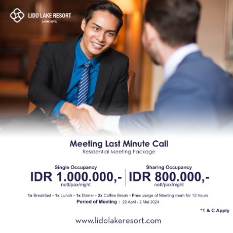 Berbeda dengan paket sebelumnya, kali ini paket meeting Sharing Occupancy ditawarkan oleh Lido Lake Resort senilai Rp 800.000,- nett per-orang untuk per-malam. Untuk paket meeting di hotel ini, sudah termasuk juga kamar deluxe yang digunakan sharing, artinya 1 kamar akan ditempati lebih dari 1 orang. Fasilitasnya tetap sama, seperti sarapan 1 kali, makan siang 1 kali, makan malam 1 kali, coffee break 2 kali, dan bebas menggunakan ruang meeting di hotel ini hingga 12 jam.