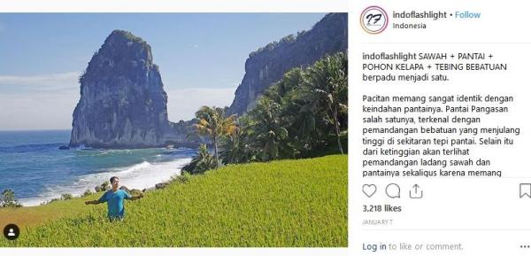 "Sawah + Pantai + Pohon Kelapa + Tebing Bebatuan berpadu menjadi satu. Pacitan memang identik dengan keindahan pantainya. Pantai Pangasan salah satunya, terkenal dengan pemandangan bebatuan yang menjulang tinggi di sekitaran tepi pantai. Selain itu dari ketinggian akan terlihat pemandangan ladang sawah dan pantainya sekaligus karena memang berdekatan. Perjalanan menuju Pantai Pangasan membutuhkan waktu sekitar 30 menit dari jalan desa, dengan melewati jalan setapak yang hanya dapat dilalui kendaraan roda dua, itupun tidak sampai di lokasi, karena jalan yang curam tidak memungkinkan dilalui kendaraan sehingga harus berjalan kaki. Tapi semuanya akan terbayar terbayar ketika tiba di pantai indah ini. Hamparan laut biru akan menyambut, begitupun udara sekitar masih sangat segar, serasi dengan pemandangan persawahan di sekitar pantai. Maka jangan heran, pantai ini kerap buat pengunjung betah berlama-lama karena kealamian dan keindahannya," tulis Instagram @Indoflashlight dikutip Jumat (18/1/2019).