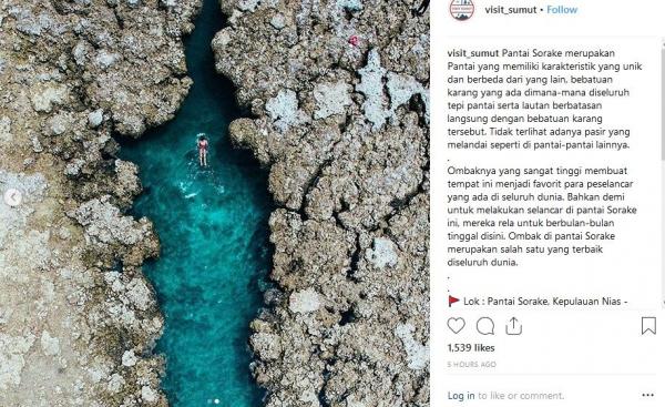 "Pantai Sorake merupakan pantai yang memiliki karakteristik unik dan berbeda dari yang lain. Bebatuan karangnya ada di mana-mana di seluruh tepi pantai, serta lautannya berbatasan langsung dengan bebatuan karang tersebut. Tidak terlihat adanya pasir yang melandai seperti di pantai-pantai lainnya. Ombaknya yang sangat tinggi membuat tempat ini menjadi favorit para peselancar yang ada di seluruh dunia. Bahkan demi untuk melakukan selancar di pantai Sorake ini, mereka rela untuk berbulan-bulan tinggal di sini. Ombak di Pantai Sorake merupakan salah satu yang terbaik di seluruh dunia," tulis Instagram @visit_sumut dikutip Kamis (18/10/2018).