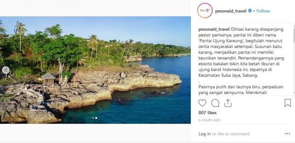 "Dihiasi karang di sepanjang pesisir pantainya, pantai ini diberi nama Pantai Ujung Kareung, begitulah menurut cerita masyarakat setempat. Susunan batu karang, menjadikan pantai ini memiliki keunikan tersendiri. Pemandangannya yang eksotis bakalan bikin kita betah liburan di ujung barat Indonesia ini, tepatnya di Kecamatan Suka Jaya, Sabang. Pasirnya putih dan lautnya biru, perpaduan yang sangat sempurna. Menikmati panorama alam yang indah ini paling seru sambil menyalurkan hobi memancing ikan. Atau bila mau aktivitas yang memacu adrenalin, kita bisa melompat dari atas karang ke laut. Seru khan! Nah, kalau ingin berwisata ke Sabang, jangan sia-siakan kesempatan menyambangi destinasi wisata lainnya," tulis Instagram @Pesonaid_travel, dikutip Senin (17/12/2018).