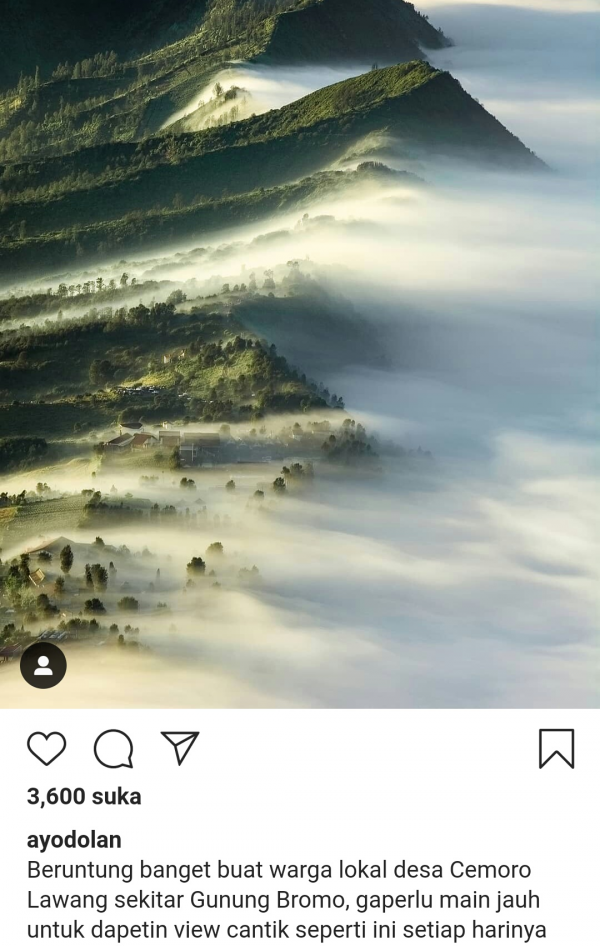 "Beruntung banget buat warga lokal Desa Cemoro Lawang sekitar Gunung Bromo, gak perlu main jauh untuk dapetin view cantik seperti ini setiap harinya. Cemoro Lawang, Probolinggo, Jawa Timur. Foto dolan dari @tian_abdulhanip," tulis Instagram @ayodolan dikutip Minggu (8/3/2020).
