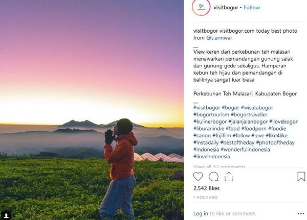 "View keren dari perkebunan teh Malasari menawarkan pemandangan Gunung Salak dan Gunung Gede sekaligus. Hamparan kebun teh hijau dan pemandangan di baliknya sangat luar biasa," tulis Instagram @VisitBogor, dikutip Selasa (11/9/2018).