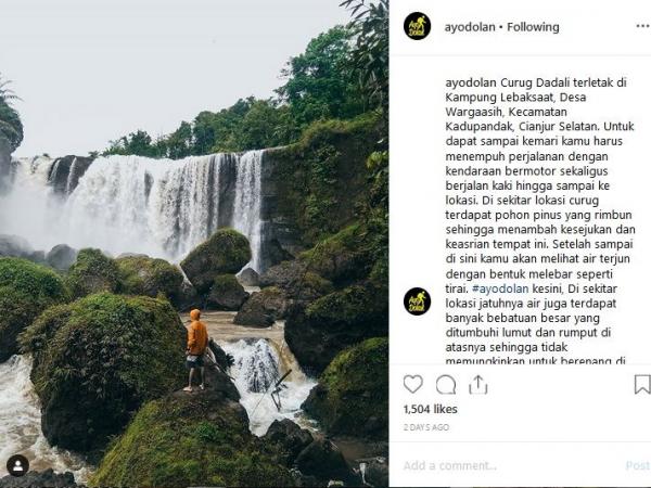 "Curug Dadali terletak di Kampung Lebaksaat, Desa Wargaasih, Kecamatan Kadupandak, Cianjur Selatan. Untuk dapat sampai kemari kamu harus menempuh perjalanan dengan kendaraan bermotor sekaligus berjalan kaki hingga sampai ke lokasi. Di sekitar lokasi curug terdapat pohon pinus yang rimbun sehingga menambah kesejukan dan keasrian tempat ini. Setelah sampai di sini kamu akan melihat air terjun dengan bentuk melebar seperti tirai. #ayodolan ke sini, di sekitar lokasi jatuhnya air juga terdapat banyak bebatuan besar yang ditumbuhi lumut dan rumput di atasnya sehingga tidak memungkinkan untuk berenang di dekat air terjun melainkan hanya bermain air. Jadi tunggu apa lagi?," tulis Instagram @ayodolan, dikutip Sabtu (30/3/2019).