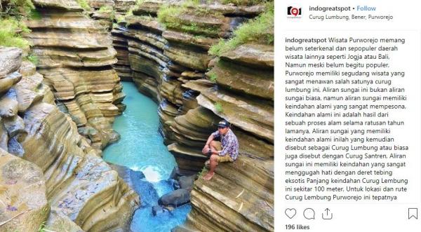 "Wisata Purworejo memang belum terkenal seperti wisata di Yogyakarta atau Bali. Meski belum begitu populer, Purworejo memiliki segudang wisata yang sangat menawan. Salah satunya Curug Lumbung. Aliran sungai ini memiliki keindahan alami yang sangat memesona. Keindahan alami ini adalah hasil dari sebuah proses alam selama ratusan tahun," tulis Instagram @indogreatspot, Senin (25/3/2019).
