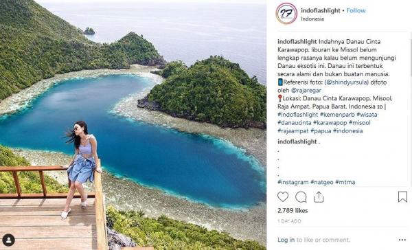 "Indahnya Danau Cinta Karawapop, liburan ke Missol belum lengkap rasanya kalau belum mengunjungi Danau eksotis ini. Danau ini terbentuk secara alami dan bukan buatan manusia," tulis Instagram @Indoflashlight dikutip Sabtu (22/12/2018).