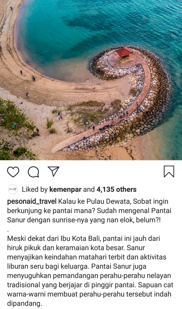 "Kalau ke Pulau Dewata, sobat ingin berkunjung ke pantai mana? Sudah mengenal Pantai Sanur dengan sunrise-nya yang nan elok belum? Meski dekat dari Ibu Kota Bali, pantai ini jauh dari hiruk pikuk dan keramaian kota besar. Sanur menyajikan keindahan matahari terbit dan aktivitas liburan seru bagi keluarga. Asyiknya lagi, Pantai Sanur juga sangat mudah dijangkau. Yuk, ke sini bareng!" tulis Instagram @pesonaid_travel, dikutip Senin (8/7/2019).