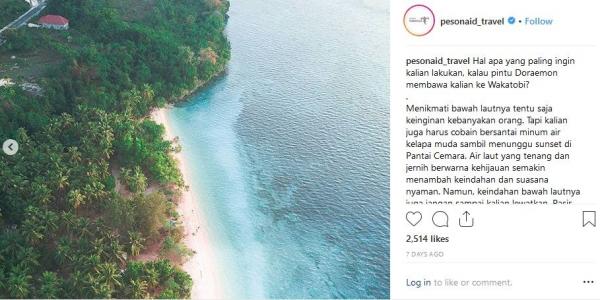 "Hal apa yang paling ingin kalian lakukan, kalau pintu Doraemon membawa kalian ke Wakatobi? Menikmati bawah lautnya tentu saja keinginan kebanyakan orang. Tapi kalian juga harus cobain bersantai minum air kelapa muda sambil menunggu sunset di Pantai Cemara. Air laut yang tenang dan jernih berwarna kehijauan semakin menambah keindahan dan suasana nyaman. Namun, keindahan bawah lautnya juga jangan sampai kalian lewatkan. Pasir pantainya putih dan asyik buat melakukan berbagai aktivitas. Nah, Wakatobi masih menyimpan sejuta keindahan yang siap menghipnotis kalian," tulis Instagram Pesonaid_Travel dikutip Kamis (6/12/2018).