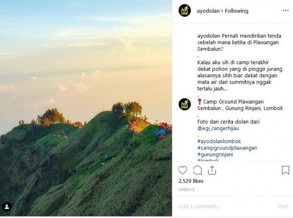 "Pernah mendirikan tenda sebelah mana ketika di Plawangan Sembalun? Kalau aku di camp terakhir dekat pohon yang di pinggir jurang. Alasannya sih, biar dekat dengan mata air dan summitnya nggak terlalu jauh," tulis Instagram @ayodolan, dikutip Rabu (27/3/2019).