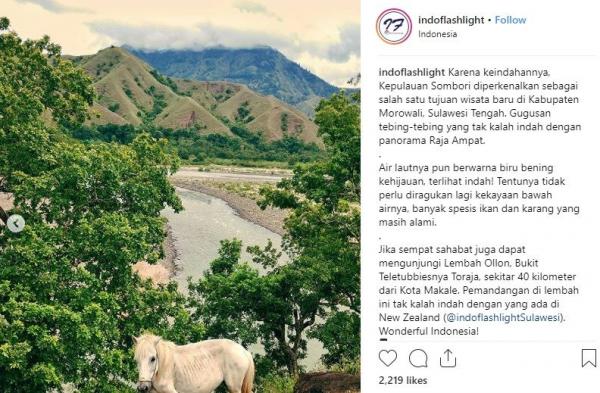 "Karena keindahannya, Kepulauan Sombori diperkenalkan sebagai salah satu tujuan wisata baru di Kabupaten Morowali, Sulawesi Tengah. Gugusan tebing-tebing yang tak kalah indah dengan panorama Raja Ampat. Air lautnya pun berwarna biru bening kehijauan, terlihat indah! Tentunya tidak perlu diragukan lagi kekayaan bawah airnya, banyak spesies ikan dan karang yang masih alami. Jika sempat, sahabat juga dapat mengunjungi Lembah Ollon, Bukit Teletubbies-nya Toraja, sekitar 40 kilometer dari Kota Makale. Pemandangan di lembah ini tak kalah indah dengan yang ada di New Zealand," tulis Instagram @Indoflashlight, Selasa (13/11/2018).