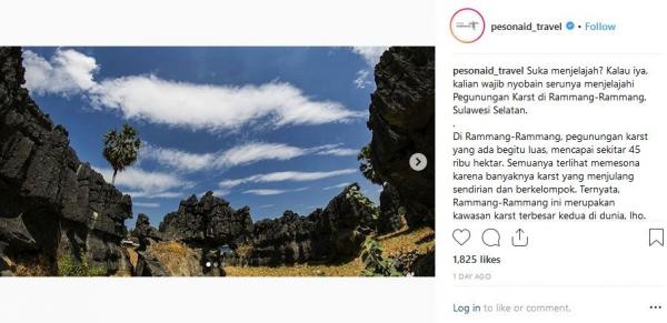 "Suka menjelajah? Kalau iya, kalian wajib nyobain serunya menjelajahi Pegunungan Karst di Rammang-Rammang, Sulawesi Selatan. Di Rammang-Rammang, pegunungan karst yang ada begitu luas, mencapai sekitar 45 ribu hektare. Semuanya terlihat memesona karena banyaknya karst yang menjulang sendirian dan berkelompok. Ternyata, Rammang-Rammang ini merupakan kawasan karst terbesar kedua di dunia, lho. Selain menjelajahi karst dan gua, kita juga bisa berperahu santai di telaga. Seru khan!," tulis Instagram @Pesonaid_Travel dikutip Rabu (12/12/2018).