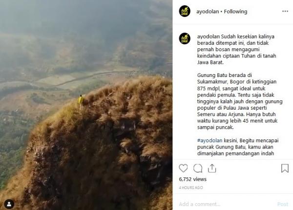 "Sudah kesekian kalinya berada di tempat ini, dan tidak pernah bosan mengagumi keindahan ciptaan Tuhan di tanah Jawa Barat. Gunung Batu berada di Sukamakmur, Bogor di ketinggian 875 mdpl, sangat ideal untuk pendaki pemula. Tentu saja tingginya kalah jauh dengan gunung populer di Pulau Jawa seperti Semeru atau Arjuna. Hanya butuh waktu kurang lebih 45 menit untuk sampai puncak. #ayodolan ke sini, Begitu mencapai puncak Gunung Batu, kamu akan dimanjakan pemandangan indah khas pegunungan. Eloknya hamparan sawah hingga gagahnya Gunung Gede Pangrango yang bisa dilihat dari kejauhan, tapi tetap berhati-hati selalu ya! Video dolan dari @estpr. In frame : @canro.simarmata," tulis Instagram @ayodolan, Kamis (5/9/2019).