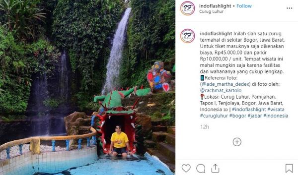 "Inilah slah satu curug termahal di sekitar Bogor, Jawa Barat. Untuk tiket masuknya saja dikenakan biaya, Rp45.000 dan parkir Rp10.000,00 per unit. Tempat wisata ini mahal mungkin saja karena fasilitas dan wahananya yang cukup lengkap," tulis Instagram @indoflashlight, Jumat (21/6/2019).