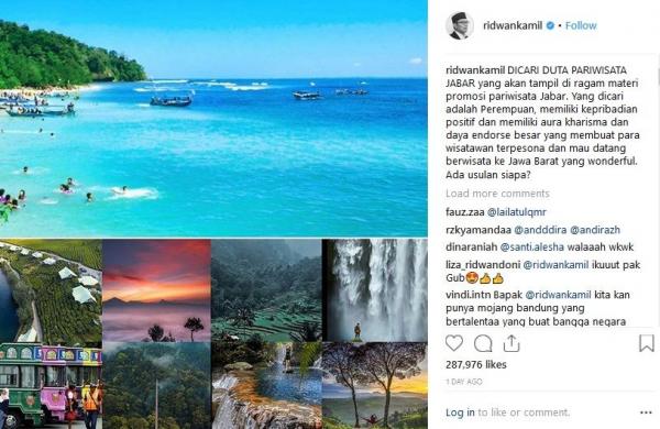 "DICARI DUTA PARIWISATA JABAR yang akan tampil di ragam materi promosi pariwisata Jabar. Yang dicari adalah Perempuan, memiliki kepribadian positif dan memiliki aura kharisma dan daya endorse besar yang membuat para wisatawan terpesona dan mau datang berwisata ke Jawa Barat yang wonderful. Ada usulan siapa?," tulis Instagram @Ridwankamil, dikutip Sabtu (12/1/2019).