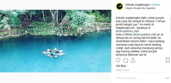 "Halo, sobat people, ada yang tau tempat ini di mana? Airnya jernih banget ya? Ini masih di Majalengka lho. Tepatnya di Situ Cipanten. Kata si Mimin @situcipanten_mjlk air di danau atau situ ini sering kali berubah. Itu disebabkan karena faktor cuaca. Kadang warnanya suka kaya ijo lumut, kadang coklat. Jadi sekarang mumpung airnya lagi bening silahkan sobat people langsung datengin aja ke @situcipanten_mjlk," tulis Instagram @inimah_majalengka, dikutip Jumat (15/3/2019).
