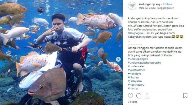 "Yang masih menikmati liburan di Klaten harus coba ke sini nih. Wisata Umbul Pongok. Keren gaes bisa foto selfie underwater seperti bro @awpuguuu. Hati-hati yah Bagas nanti kebayakan nyelem jadi lupa napas. Umbul Ponggok merupakan sebuah kolam alami yang dikembangkan menjadi wisata tirta yang cukup terkenal di Klaten," tulis Instagram @kudungetrip.kuy, Rabu (20/3/2019).