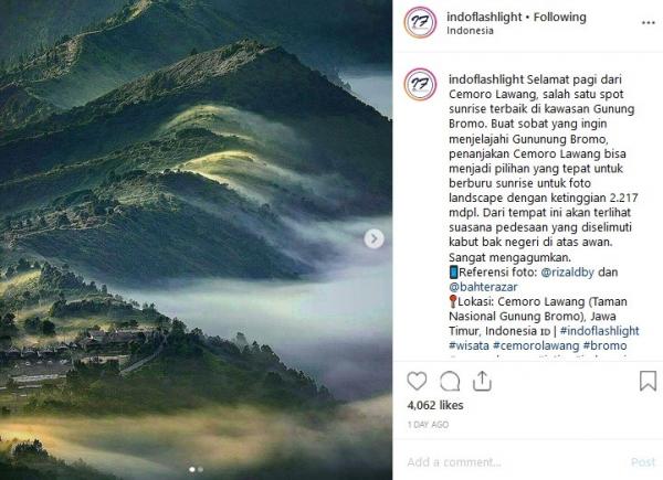 "Selamat pagi dari Cemoro Lawang, salah satu spot sunrise terbaik di kawasan Gunung Bromo. Buat sobat yang ingin menjelajahi Gunung Bromo, Pananjakan Cemoro Lawang bisa menjadi pilihan yang tepat untuk berburu sunrise. Foto landscape dengan ketinggian 2.217 mdpl. Dari tempat ini akan terlihat suasana pedesaan yang diselimuti kabut bak negeri di atas awan. Sangat mengagumkan," tulis Instagram @indoflashlight, dikutip Selasa (28/5/2019).