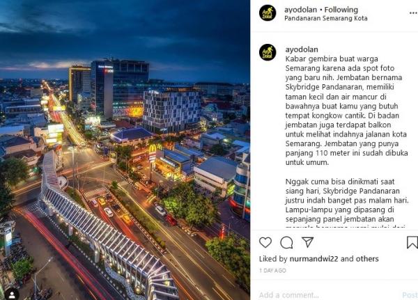 "Kabar gembira buat warga Semarang karena ada spot foto yang baru nih. Jembatan bernama Skybridge Pandanaran, memiliki taman kecil dan air mancur di bawahnya buat kamu yang butuh tempat kongkow cantik. Di badan jembatan juga terdapat balkon untuk melihat indahnya jalanan kota Semarang. Jembatan yang punya panjang 110 meter ini sudah dibuka untuk umum. Foto dolan dari @adi_mrizal," tulis Instagram @ayodolan dikutip Kamis (5/3/2020).