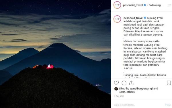 "Di puncak gunungnya terdapat sebuah menara. Bila kita mengelilingi menara itu, artinya kita sudah menginjakkan kaki di lima kabupaten. Seru, kan! Kuy, lah!" tulis Instagram @pesonaid_travel, dikutip Rabu (6/11/2019).