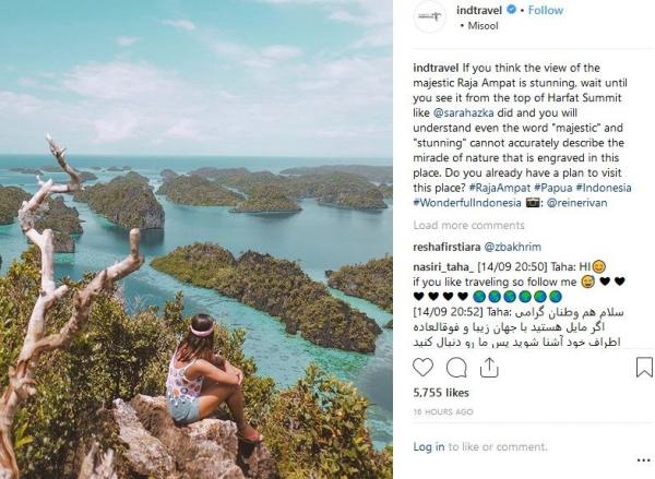 "Jika Anda dapat membayangkan pemandangan Raja Ampat yang megah menakjubkan, tunggu sampai Anda melihatnya dari puncak Harfat Summit seperti yang dilakukan @sarahazka. Anda akan mengerti kenapa kata 'megah' dan 'memukau' tidak dapat secara akurat menggambarkan keajaiban alam yang diukir di tempat ini. Apakah Anda sudah punya rencana untuk mengunjungi tempat ini? #RajaAmpat #Papua #Indonesia #WonderfulIndonesia," tulis Instagram @indtravel, dikutip Sabtu (15/9/2018).