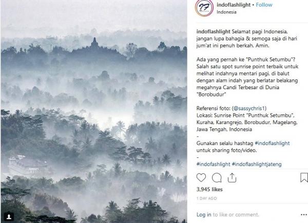 "Ada yang pernah ke Punthuk Setumbu? Salah satu spot sunrise point terbaik untuk melihat indahnya mentari pagi, dibalut dengan alam indah yang berlatar belakang megahnya candi terbesar di dunia, Borobudur," tulis Instagram @Indoflashlight, dikutip Sabtu (13/10/2018).
