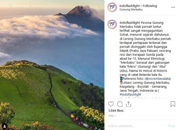 "Sobat, menurut sejarah, dahulunya di Lereng Gunung Merbabu pernah terdapat pertapaan terkenal dan pernah disinggahi oleh Bujangga Manik (Prabu Jaya Pakuan) seorang resi dari Kerajaan Sunda pada abad ke-15. Menurut Etimologi, Merbabu berasal dari gabungan kata Meru (Gunung) dan Abu (Abu). Nama ini mincul di historis yang di catat Belanda kala itu," tulis Instagram @indoflashlight, dikutip Sabtu (4/5/2019).
