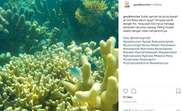 "Sudah pernah ke dunia bawah air Gili Noko belum guys? Ternyata cantik banget lho. Yang pasti kita harus menjaga ekosistem terumbu karang. Paling mudah adalah dengan tidak menyentuhnya," tulis Instagram @gresiktourism, Sabtu (4/8/2018).