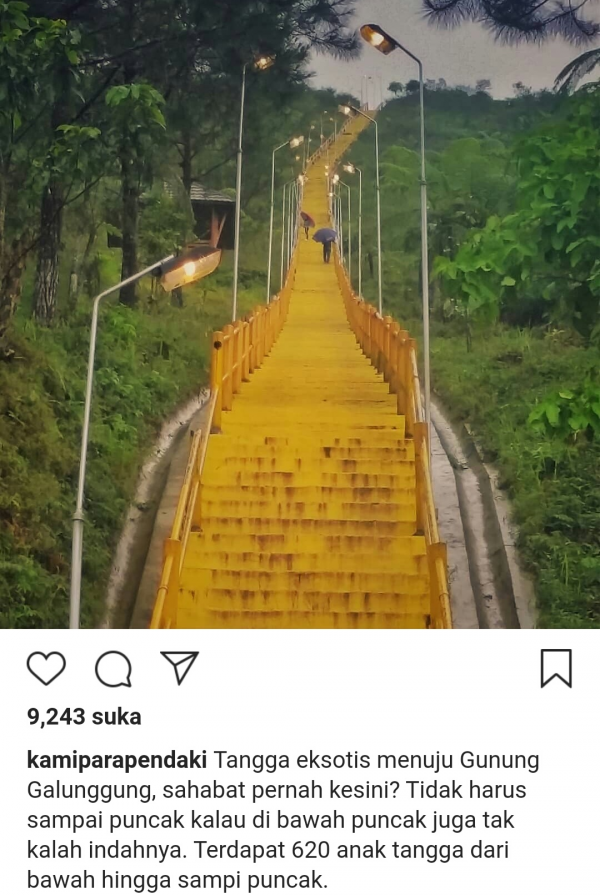 "Tangga eksotis menuju Gunung Galunggung, sahabat pernah ke sini? Tidak harus sampai puncak kalau di bawah puncak juga tak kalah indahnya. Terdapat 620 anak tangga dari bawah hingga sampi puncak," tulis Instagram @kamiparapendaki, dikutip Senin (30/12/2019).