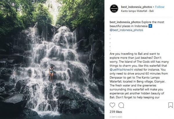 "Apakah Anda ingin bepergian ke Bali dan menjelajahi lebih dari sekadar pantai? Jangan khawatir, The Island of The Gods masih memiliki banyak hal yang dapat memikat Anda, seperti air terjun ini yang dikunjungi oleh @uelifrischknecht. Anda hanya perlu berkendara sekitar 60 menit dari Denpasar untuk mencapai Air Terjun Kanto Lampo, yang terletak di desa Beng, Gianyar. Air tawar dan lingkungan hijau di sekeliling air terjun ini akan membuat Anda mendapatkan keindahan tersembunyi di Bali. Jangan lupa untuk menjaga alam tetap bersih dan alami," tulis Instagram @best_indonesia_photos, dikutip Jumat (10/8/2018).